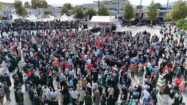 Sakarya Millet Bahçesi’nde bir araya gelen binlerce kişi ellerinde Filistin bayraklarıyla, “Özgür Filistin” ve “Kahrolsun İsrail” gibi sloganlarla şehrin merkezinde yürüdü.